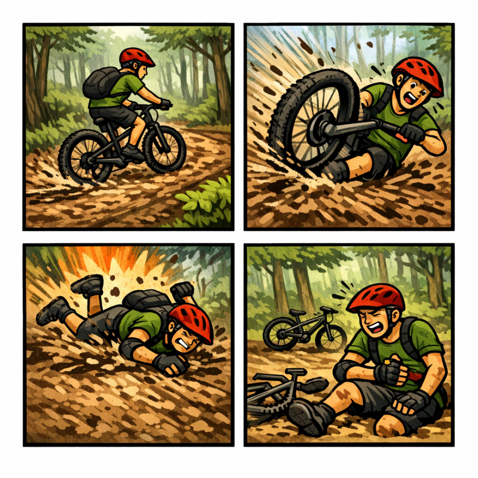 The trail was still damp from the previous night’s rain, the kind of damp that looks harmless until your front wheel politely decides it no longer wants to participate in the concept of friction. I wasn’t even going fast — which is the embarrassing part. At higher speed, the wheel probably would’ve cut through the mud instead of surfing on it like a bored seal. But no. Slow and careful was apparently the wrong choice of the day.